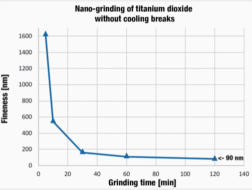 The new grind sizes in the nano-metre range are due to the new jars designed to optimise usage of jar volume. The Mixing Machine MM 500 Nano reaches a fineness of < 100 nm due to the maximised energy input of 35 Hz and as there are less warming effects, the grinding can be done without breaks for cooling down. The below diagram displays the Nano grinding of titanium oxide without cooling breaks and shows a particle size of 90 nm was achieved after 120 minutes of grinding: