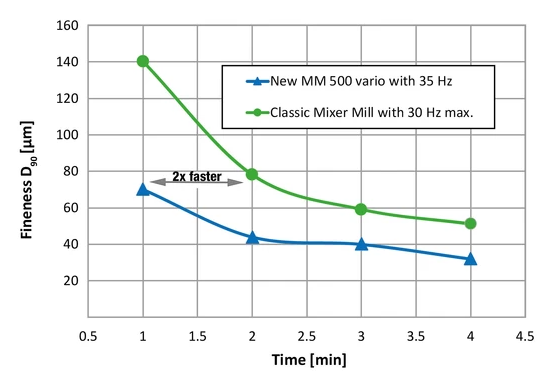 Grinding time in the MM 500 Vario milling machine is 50% less than a standard ball mill that has only 30 Hz. The Vario has six grinding stations to ensure that high throughput can be reached and is 6 times higher than any standard mixer mill. The below graph displays the grinding of basalt in the MM 500 Vario and how it achieves better fineness compared to a class milling machine due to the 35 Hz.
