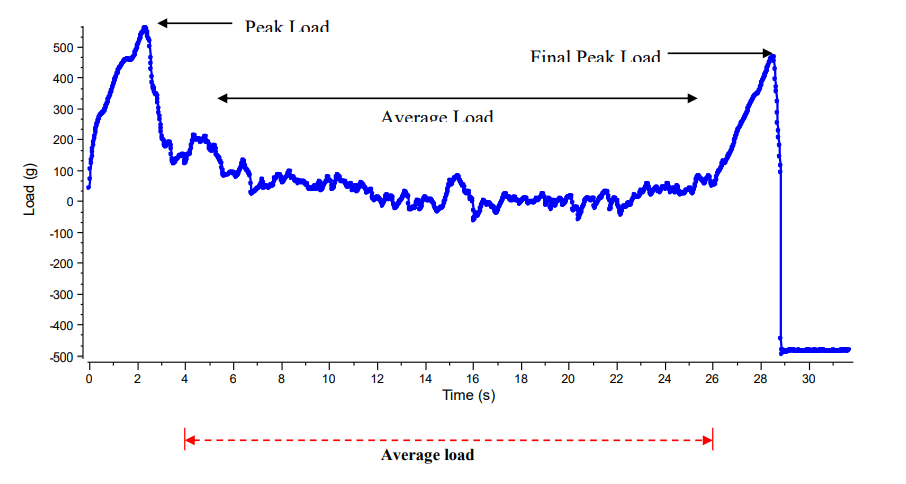 The mean load indicated on the graph is the average force required to weaken and tear the packaging seal.
